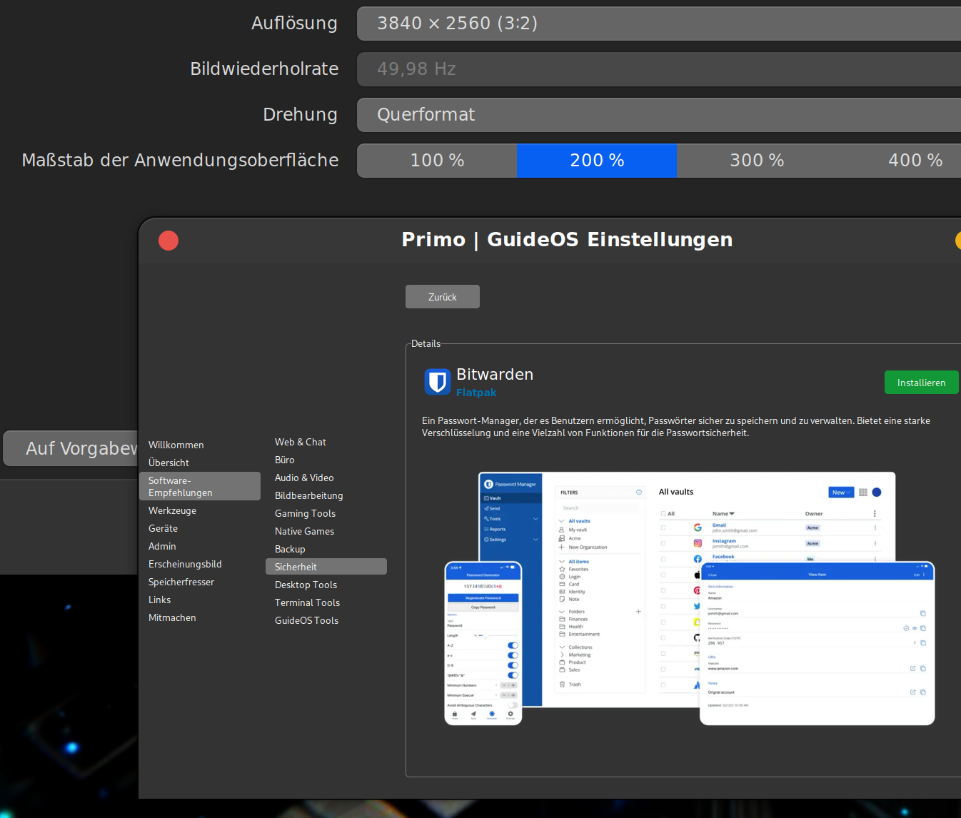 Ich fahre eine Auflösung von 3840 x 2560 (3:2) und einen 200% Maßstab der Anwendungsoberfläche.